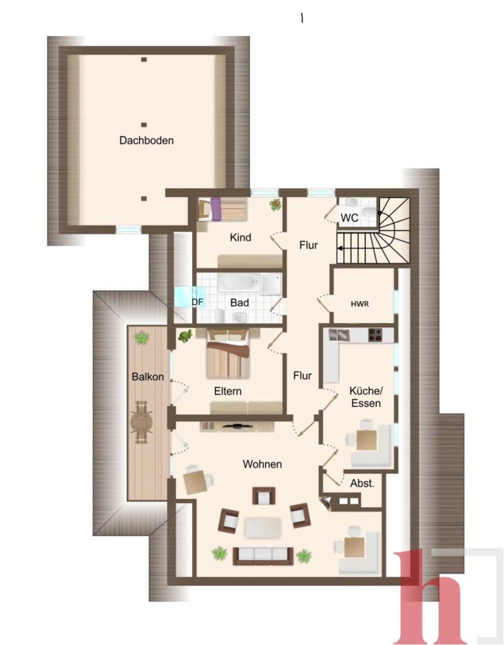 - Wohnen, 2 Zimmer, Küche/Essen, Bad, G-WC, HWR, ASR, Flur, kleiner Balkon