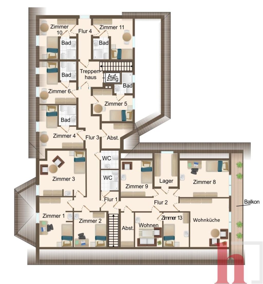 - 5 Pflegezimmer mit Bad, 7 Pflegezimmer mit