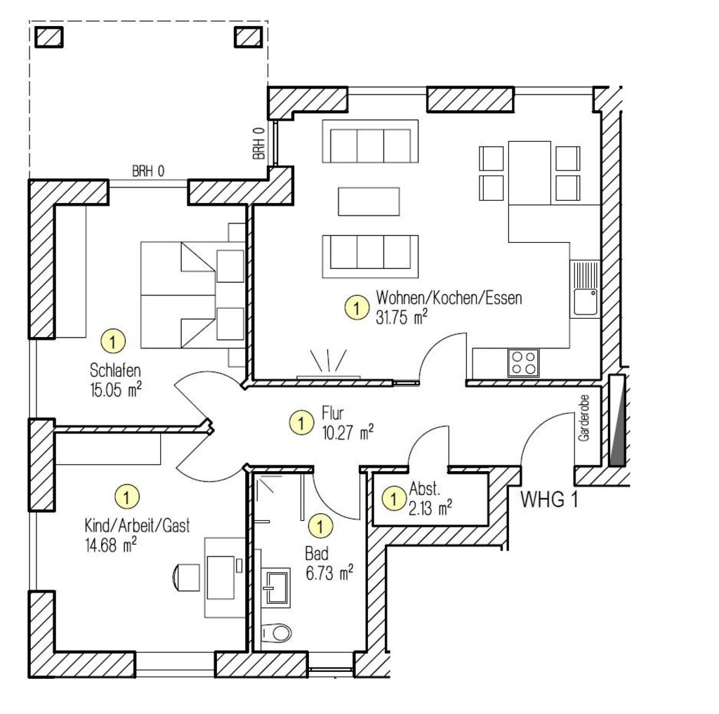 Drei Zimmer, offenes Wohnen, hochwertige Küchenzeile vorhanden, Flur, Badezimmer, Hauswirtschaftsraum, eigener Abstellraum außen, Garten, Gemeinschaftsraum, eigener Kfz-Stellplatz