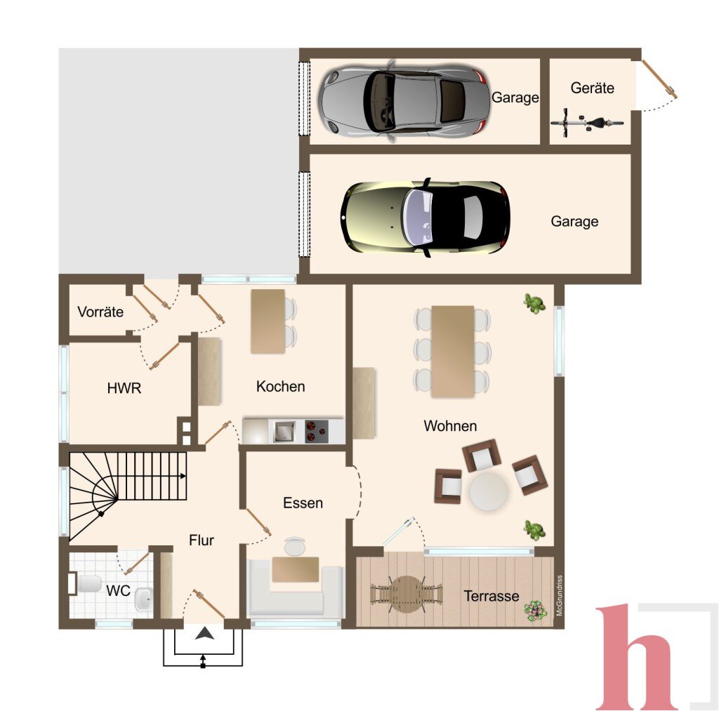 - Wohn-/Esszimmer, 1 Zimmer, Küche, Diele, G-WC, Speisekammer, Windfang, große überdachte Terrasse