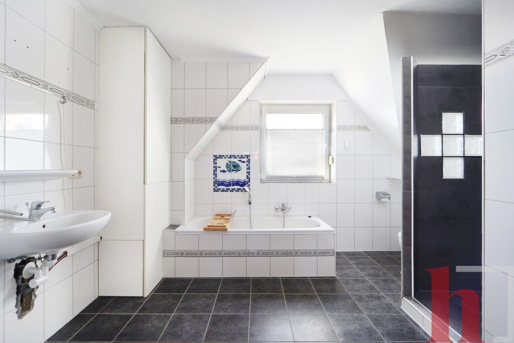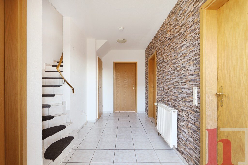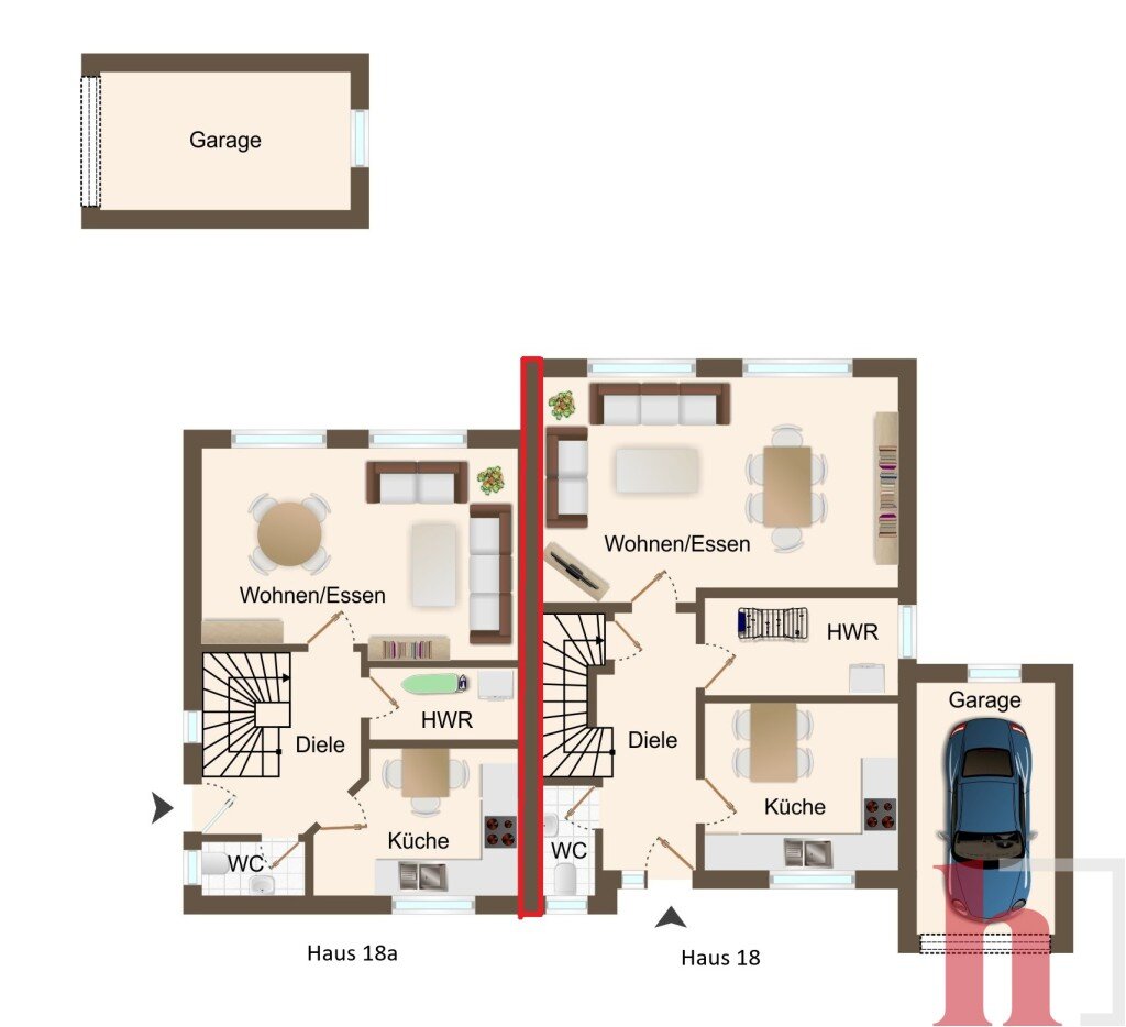 - Wohnen, Küche, ASR, HWR, Flur, G-WC, Terrasse, Garten.