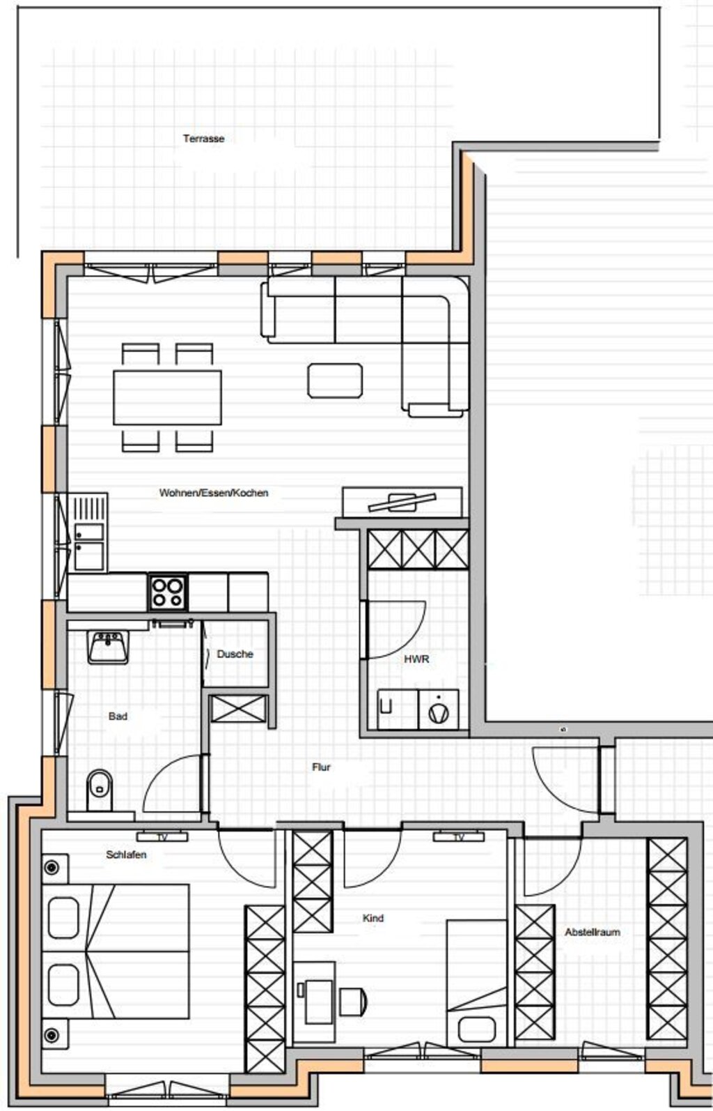 4 Zimmer, offener Wohn- und Essbereich, Flur, Badezimmer mit ebenerdiger Dusche, Hauswirtschaftsraum, Garten mit Terrasse