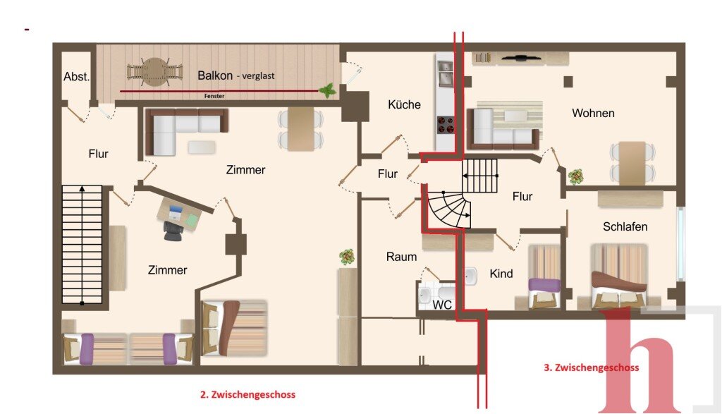 - 3 Zimmer, 2 Flure, WC, verglaster Balkon
