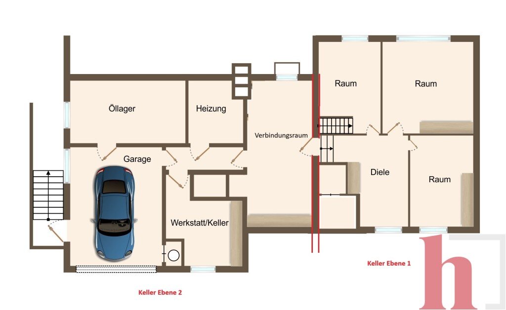 - Ebene 2 mit Werkstatt, ehemaliges Öllager, Heizung, Flur, Verbindungsraum, Garage