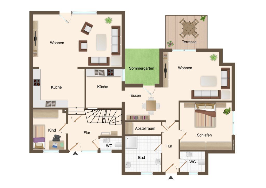 - Wohnen/Essen, Küche, Schlafen, Bad, WC, Flur, Abstellraum, Sommergarten