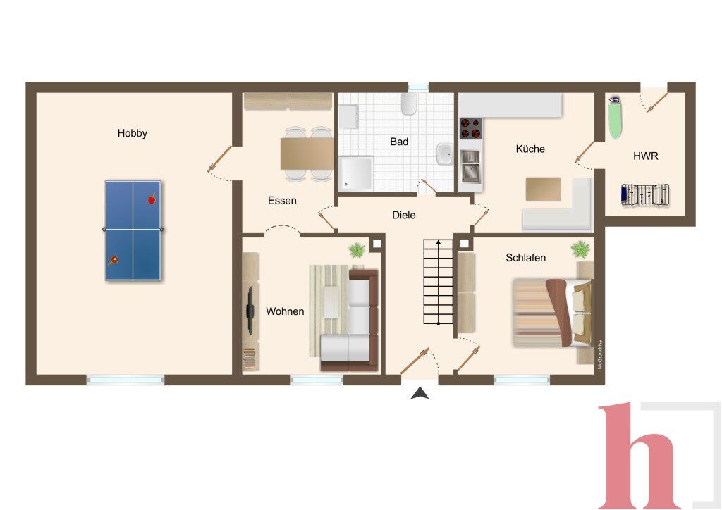 - Wohnen/Essen, Küche, HWR, Schlafzimmer, Bad, Flur, Hobbyraum